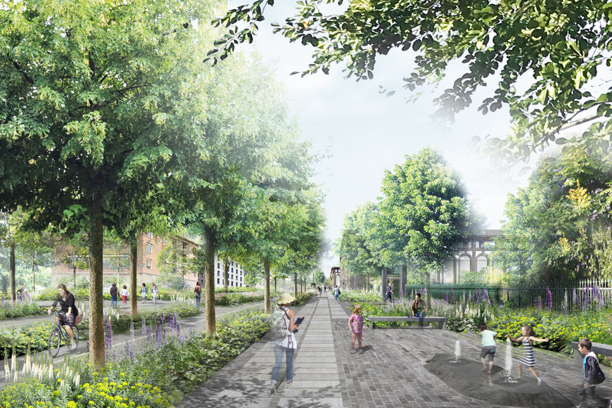 150 nouveaux arbres seront plantés, formant avec les tilleuls existants, un couvert végétal dense, favorisant la biodiversité. Toutes les lignes d’arbres seront plantées en pied de massifs, formant un jardin en « lanières » d’environ 5 000 m². Le projet sera composé de 17% d’espace de « pleine terre », loin des sols majoritairement bitumeux actuels. Des fontaines et jeux de brumes rafraichiront l’air au moyen d’une domotique intelligente.