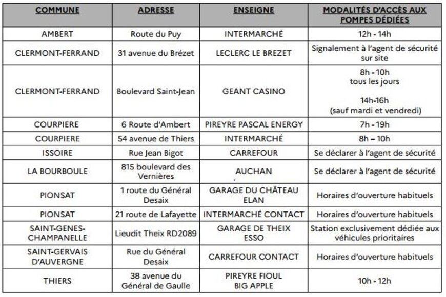 La liste des 12 stations retenues pour fournir les véhicules prioritaires a été publiée sur le site internet de la Préfecture du Puy-de-Dôme. Pour s’assurer du bon déroulement des opérations, des contrôles des forces de sécurité intérieure seront réalisés sur site.