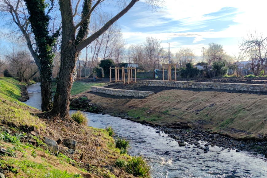 Le profilage du cours d’eau a été revu sur ce secteur. Des méandres ont été créés. Les berges ont été réaménagées en pentes douces et végétalisées. Enfin, des caches piscicoles ont été agencées pour favoriser la biodiversité.